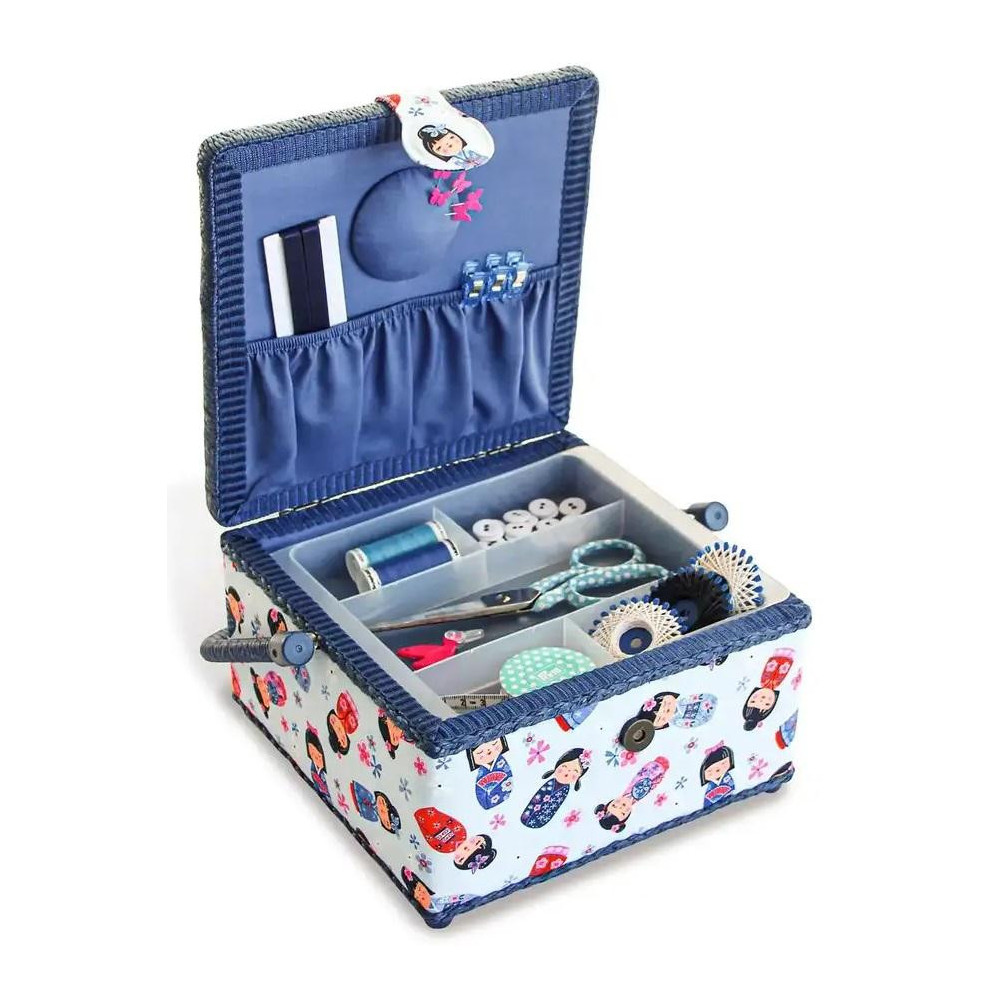 Čtvercová textilní kazeta na šicí potřeby. Plastová vložka se pěti oddíly, madlo, praktické zapínání na magnet.