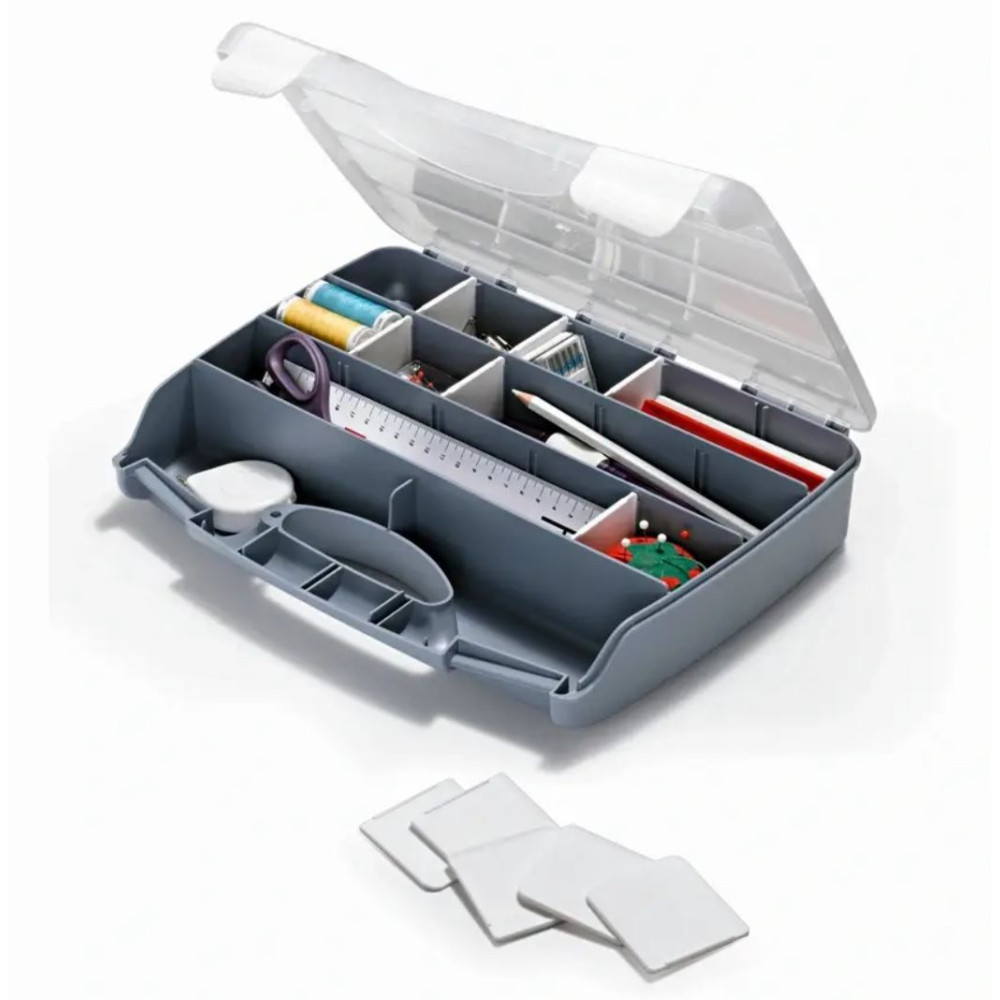Plastový zásobník - kufřík s variabilními přepážkami. Vhodný pro uložení šicích, výtvarných a nebo hobby potřeb. Rozměry 316x260x60 mm.