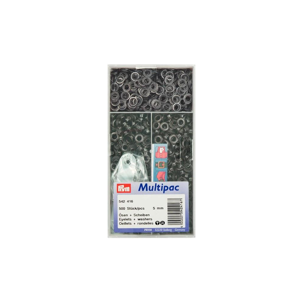 Mosazné průchodky Prym 5 mm v černém oxidovaném provedení s podložkou, balení 500 ks. Ideální pro textil, kůži a další materiály.