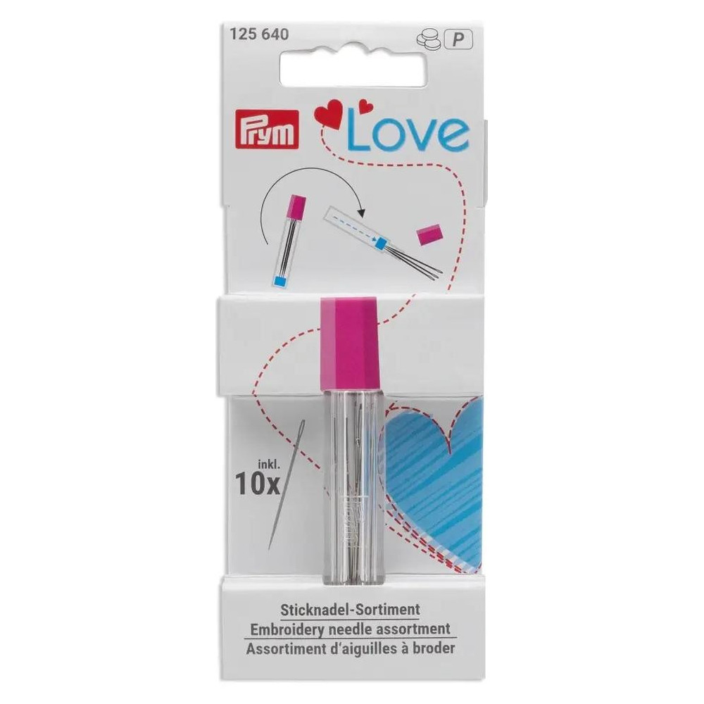 Tato sada obsahuje 10 vyšívacích jehel tupých i ostrých uložených v praktickém pouzdře z kolekce Prym Love. Pouzdro je navrženo pro bezpečné uložení jehel a obsahuje integrovaný magnet pro snadné vyjmutí jehel. Jeho šestihranný tvar zajišťuje stabilitu při položení na pracovní plochu.