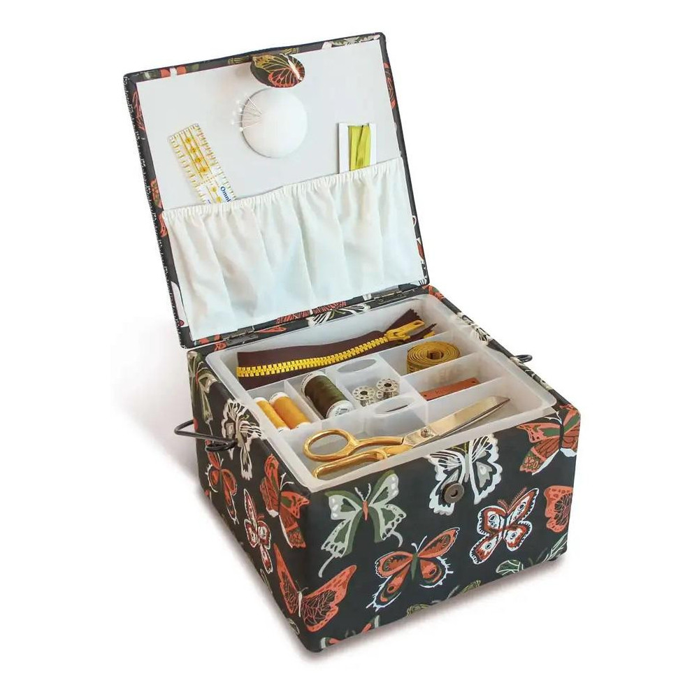 Větší čtvercová kazeta na skladování a transport šicích potřeb. Plastová vložka se 7 oddíly, madlo, praktické zapínání na magnet, jehelníček a 2 látkové kapsy na vnitřní straně víka.