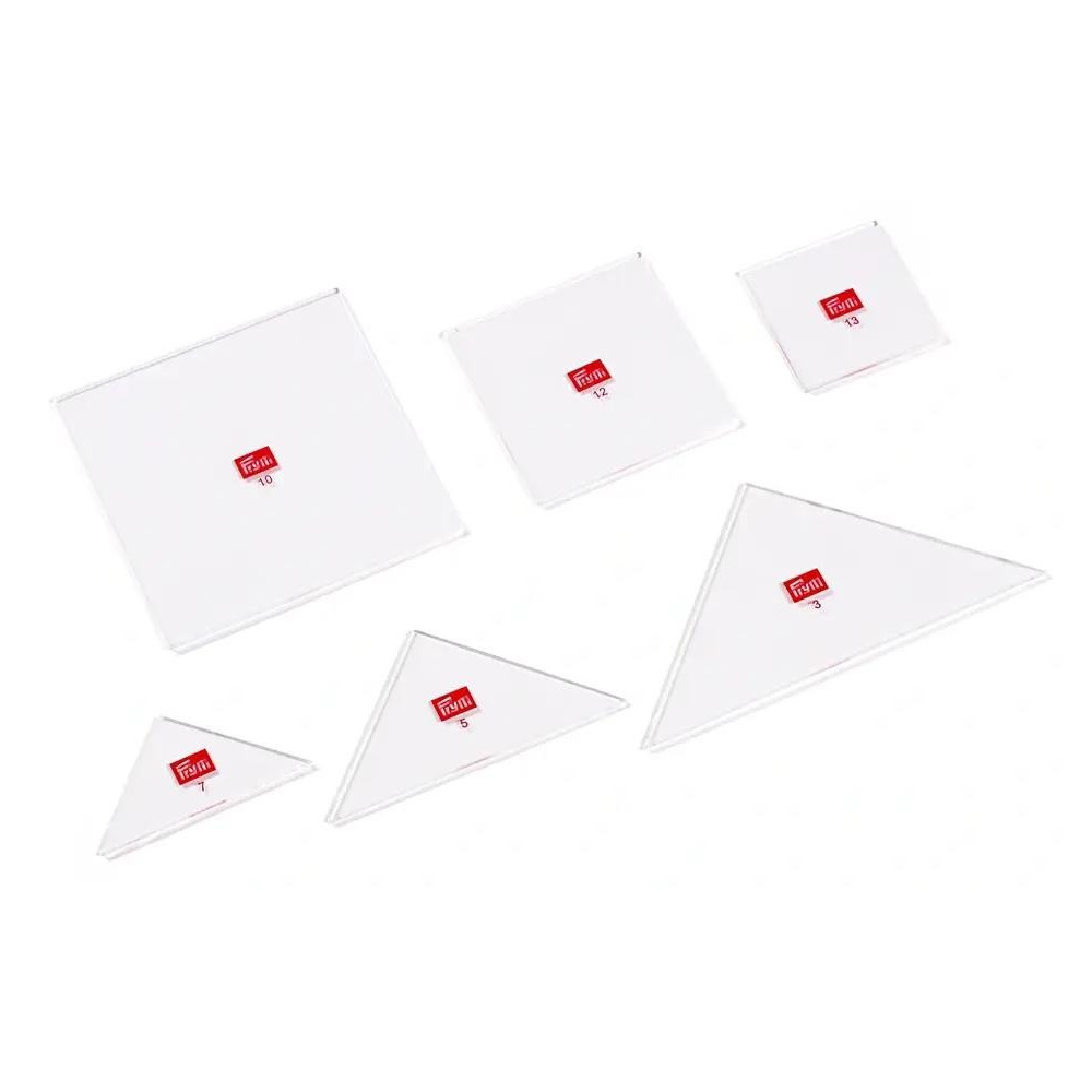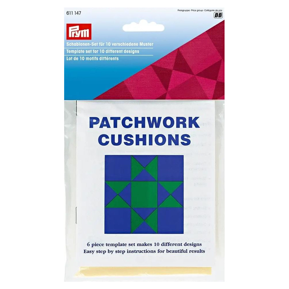 Tato sada šablon od společnosti Prym je navržena pro snadné vytváření deseti klasických patchworkových vzorů. Obsahuje čtvercovou šablonu a odpovídající trojúhelníkovou šablonu, každou ve třech velikostech: 2 palce, 2,8 palce a 4 palce. Sada je ideální jako startovací balíček pro všechny začátečníky v patchworkových projektech. Balení obsahuje anglické pokyny, které vysvětlují proces v pěti jednoduchých krocích. Sada také představuje deset nejoblíbenějších designů pro patchworkové deky nebo polštáře, jako jsou: Card Trick, Spinning Geese, Waterwheel a Double T.