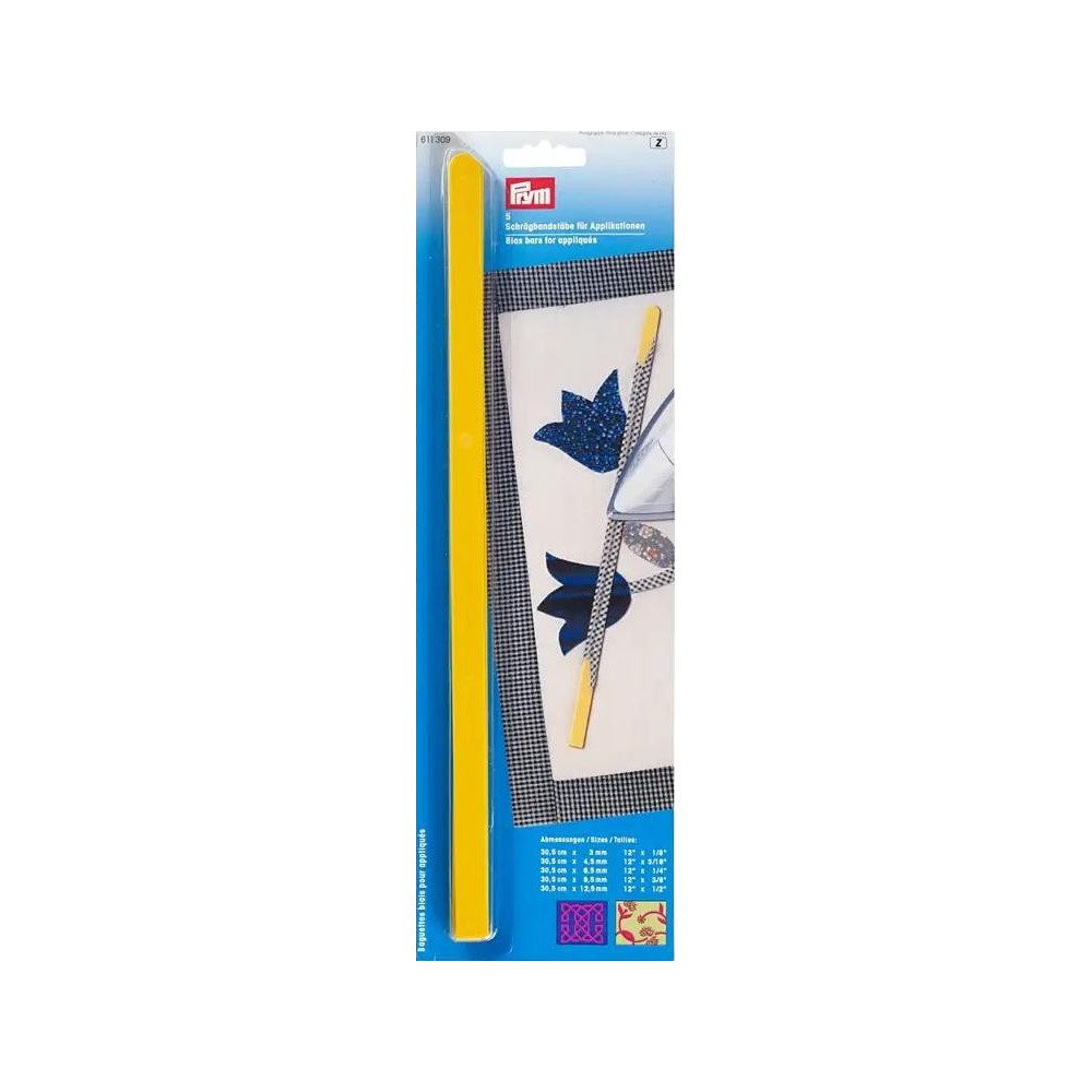 Prym šikmé lišty jsou ideálním nástrojem pro výrobu krátkých šikmých proužků o délce až 30,5 cm, zejména vhodné pro aplikace, jako jsou stonky květin. Při nařezání látky pod úhlem 45 stupňů k osnově se materiál stává flexibilním a snadno se tvaruje i do oblouků. Lišty jsou vyrobeny z tepelně odolného plastu, což umožňuje žehlení švu přímo na liště zabalené v látce. Sada obsahuje pět lišt o délce 31,5 cm a šířkách 3 mm, 4,5 mm, 6,5 mm, 9,5 mm a 12,5 mm.