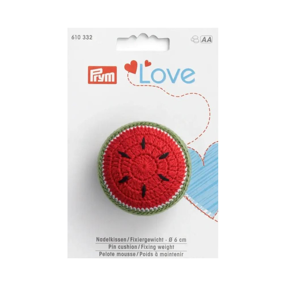 Prym Love jehelníček a závaží v jednom je praktický nástroj, který usnadňuje práci při šití. Tato roztomilý jehelníček slouží zároveň jako závaží na střihy. Váží přibližně 22 gramů a má průměr 5 cm. Díky své váze bezpečně drží střihy na místě během práce. Kromě toho může být naplněn pískem a použit jako antistresová pomůcka. K dispozici je ve třech typech: oranžová, kiwi a meloun.