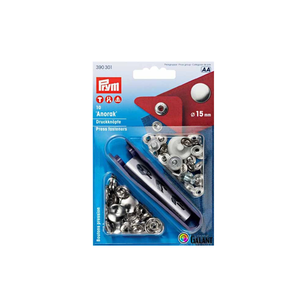 High-quality ANORAK snap button with a 15 mm diameter in an elegant silver finish by the renowned brand Prym. Perfect for jackets, coats, bags, and other textile products. Made from durable material, these buttons provide a reliable fastening solution. The package contains 10 buttons neatly arranged on a convenient card. An excellent choice for both professional and home sewing projects.