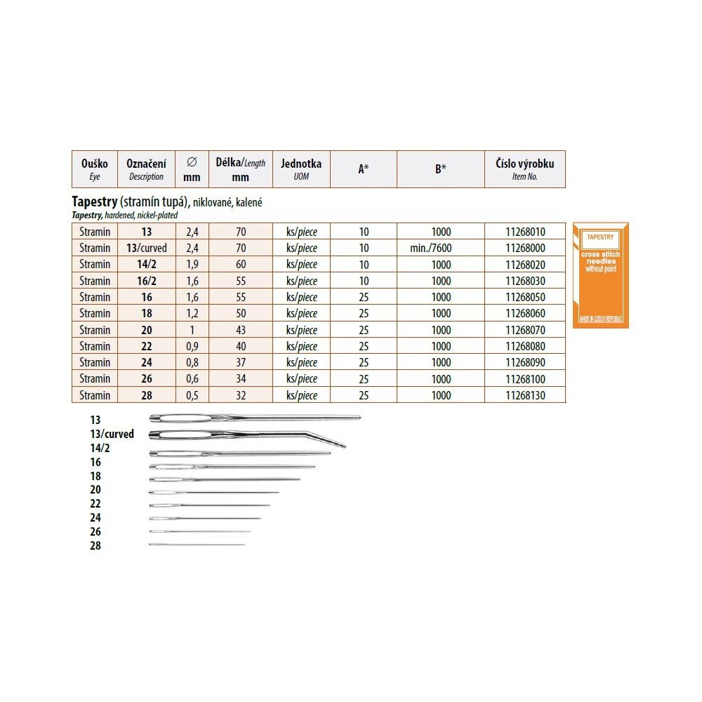 Jehly TAPESTRY (Stramín tupá) jsou kalené, neohybají se. Díky kvalitnímu broušenému a niklovanému povrchu se v látce nezadrhávají. Dokonale tvarované ouško je šetrné vůči niti a netrhá ji.