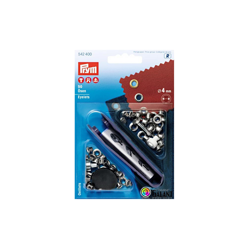 These brass eyelets without washers, 4 mm in diameter, are ideal for use in the textile and leather industries. The package contains 50 pieces on a card along with necessary accessories, including a punching tool that facilitates their application. For installation, you can use the included tool and hammer or Vario 390900 pliers or tripod 673130. This product is supplied by the renowned brand Prym and is suitable for a wide range of applications.