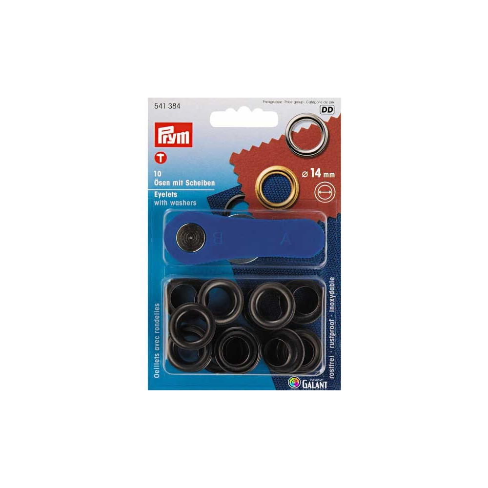 Brass eyelets with washers, 14 mm in diameter, featuring an elegant black oxidized finish by the renowned brand Prym, are ideal for both professional and home sewing projects. The pack includes 10 pieces on a card along with a hole punch tool, facilitating easy installation. For application, you can use the included tool and hammer or Vario pliers. These eyelets are suitable for use on fabrics where a strong and durable hole is needed, such as in clothing, bags, or other textile products.