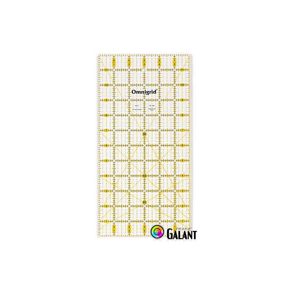 The patchwork ruler by Omnigrid-Prym, sized 6 x 12 inches, is an essential tool for anyone involved in patchwork, sewing, and other creative activities. Made from high-quality material, it offers durability and long-lasting performance. Its transparent design with accurate markings ensures easy measurement and precise placement on fabric. Suitable for use with rotary cutters and blades. The package contains 1 piece in protective foil.