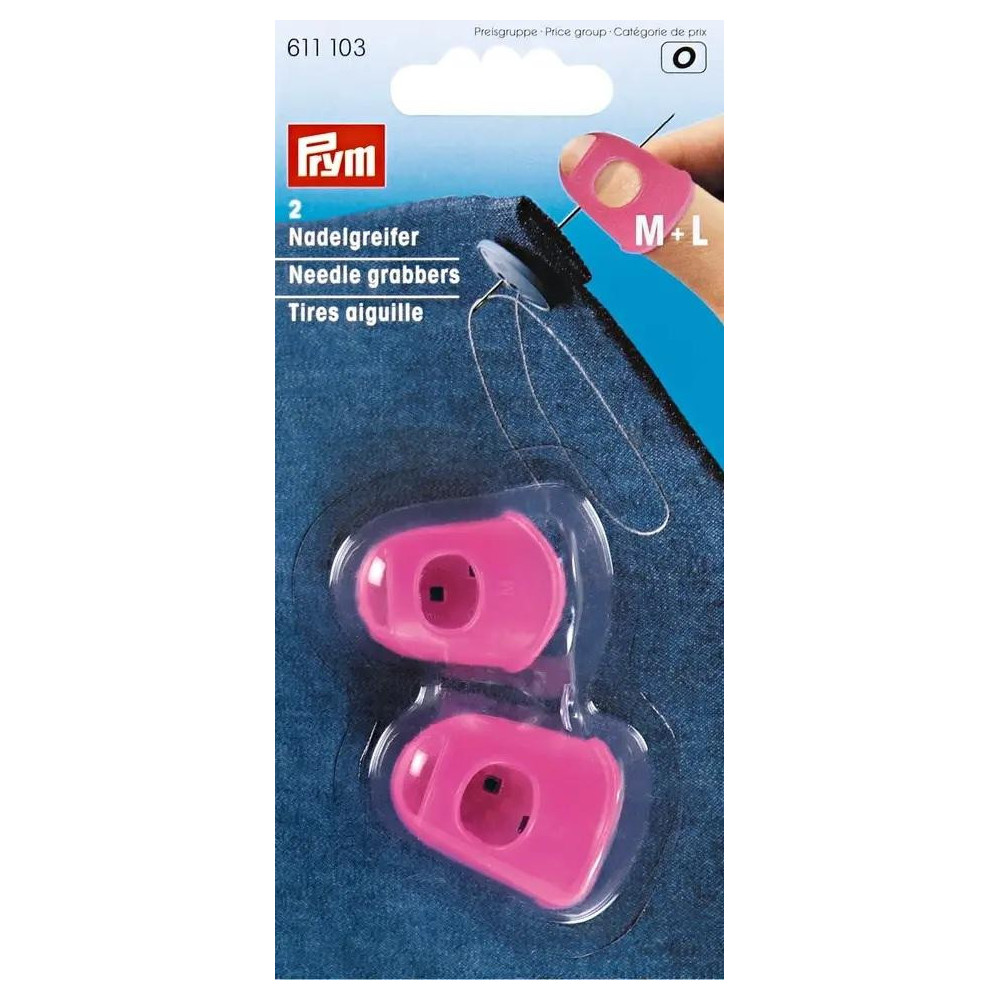 The Prym Silicone Needle Grabber, shaped like a thimble, is an essential tool for hand sewing, especially when pulling needles through multiple layers of fabric or sturdy materials. Made from silicone, it ensures a firm grip on the needle and protects fingers from injury. The grabber features ventilation slots on the underside and a front opening accommodating longer fingernails, ensuring comfortable wear. Each pack contains two grabbers in sizes M (14 mm) and L (19 mm), suitable for the thumb and index or middle finger. Available in turquoise or pink.
