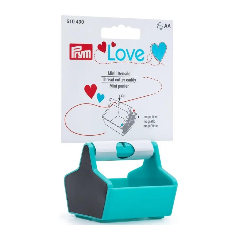The Prym Love Thread Cutter Caddy is a practical accessory for anyone who enjoys sewing. It is designed to hold a spool of sewing thread, pins, needles, and a thimble. Both side panels are magnetic, making it easy to collect and store loose pins and needles. An additional convenient feature is the integrated thread cutter in the handle, allowing for quick and easy thread cutting. The caddy measures approximately 5 x 5 x 5 cm.